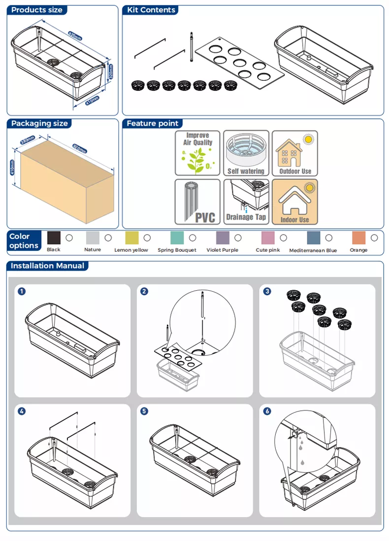 This 30L Self watering Planer is suitable for growing vegetables, green plants, and flowers. It is equipped with a water level gauge to monitor the water level. When the water level exceeds the maximum value, you need to drain the water from the pot. There is a drainage valve on the side of the pot. Push it inwards to close it and pull it outwards to drain the water. This pot can be used both indoors and outdoors. When using it outdoors, make sure to open the drainage valve to prevent water from accumulating in the pot due to rain.