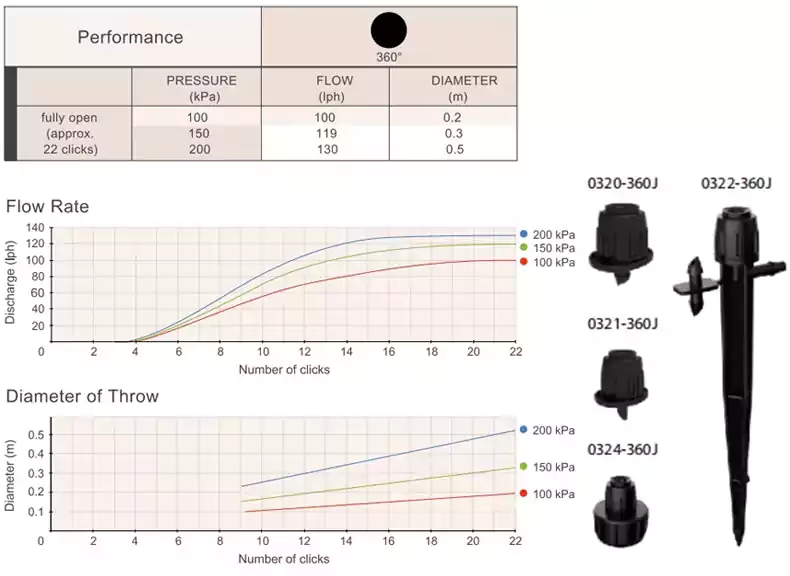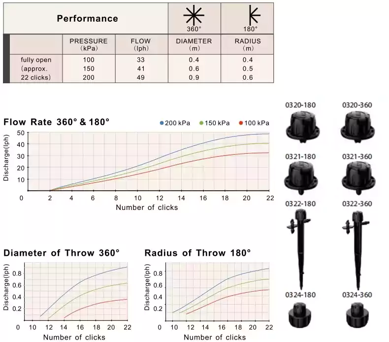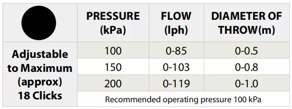 Rotation of the Mini Bubbla cap allows simultaneous adjustment of flow rate and diameter of throw. This Adjustable flow Twista sprayer a uniform umbrella pattern that gently applies water to the root zone of the plant.