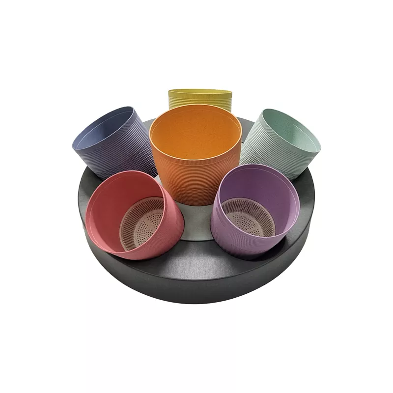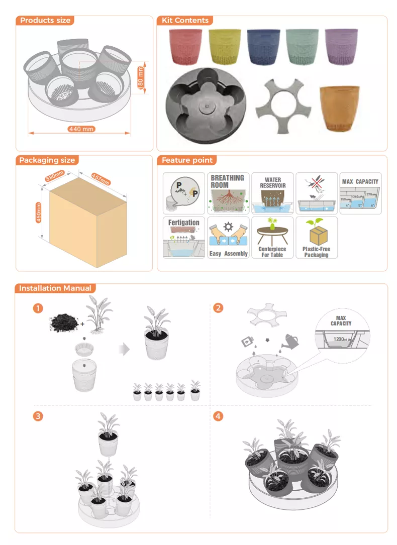 Eco Gardening round pot Planter The set of components consists of six flowerpots with breathable bottoms and a circular base for water storage.Among them, there are five 5 '' flowerpots and one 6'' flowerpot.