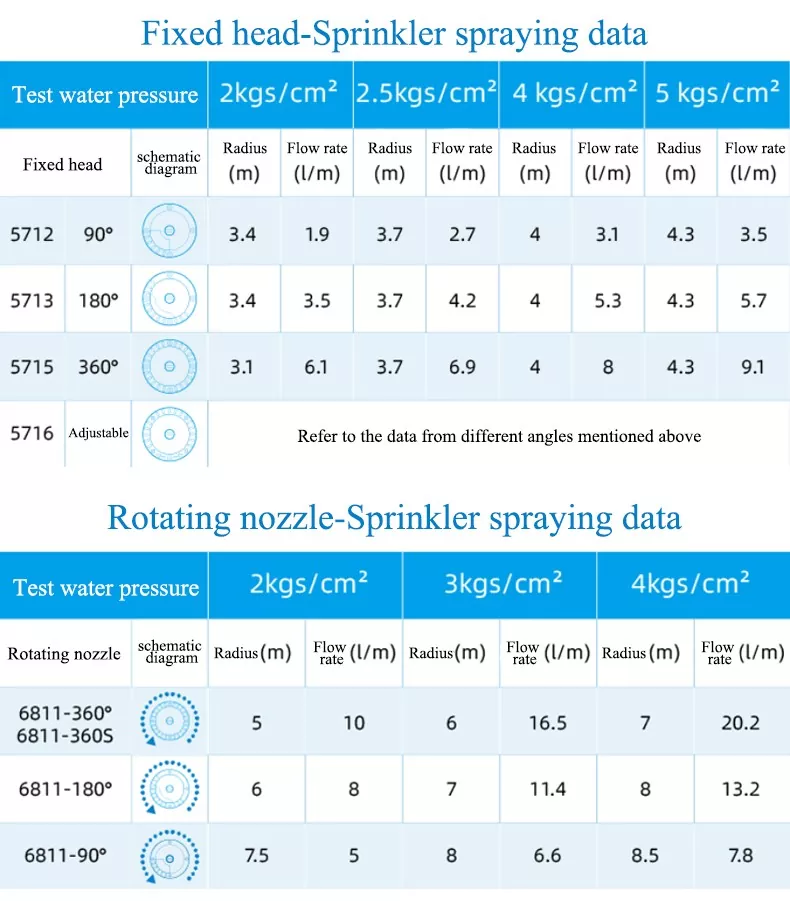 Our products cover two types of sprinklers: rotary and fixed. Both rotary and fixed sprinklers offer Angle options such as 90°, 180°, and 360°, paired with customizable Angle indoor sprinklers, they can meet the needs of different irrigation scenarios from fixed areas to flexible adjustments, from small corner areas to large entire areas, without the need to purchase additional equipment.