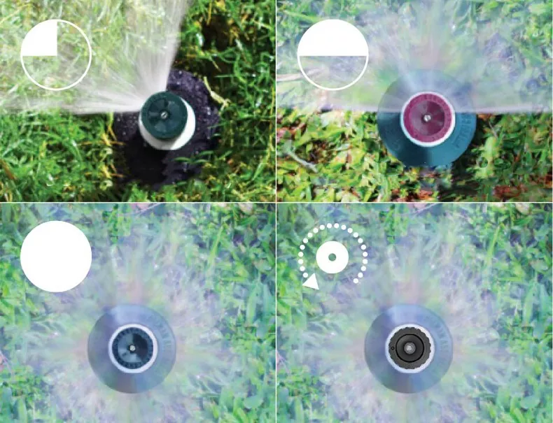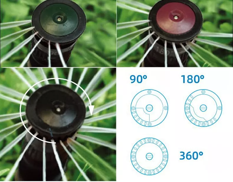 1、There are 90° , 180° ,270° ,360° and adjustable heads for more choice, the fully adjustable nozzle ensure that all spray patterns are covered without the need to change nozzle. Indication on the nozzles ( See below). 2、Accepts RIANBIRD compatible Pop-up sprinkler.