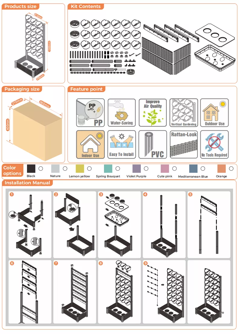 Whether you want to grow some common vegetables like lettuce and cherry tomatoes, or herbs like rosemary and mint, or succulents of various shapes and colorful flowers, Self standing Patio Vertical Garden can accommodate them perfectly. You can freely combine and match according to your own preferences, create your own exclusive vertical garden by hand, and experience the unique fun of DIY gardening.