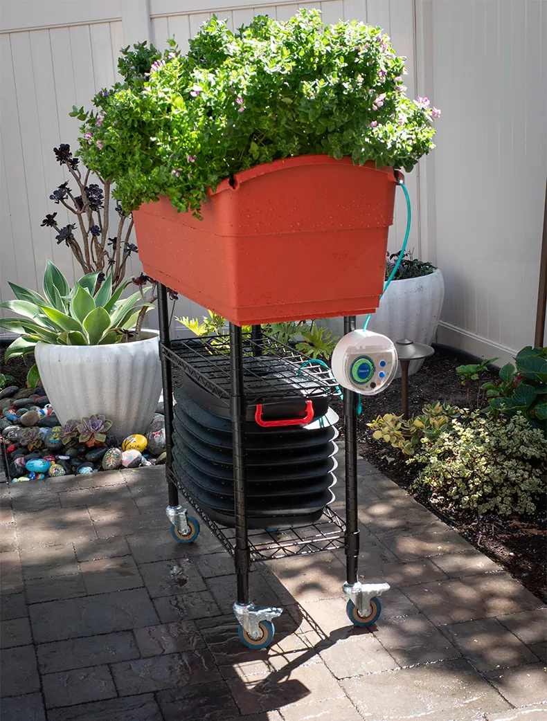 Solve your water source problem, Smart Watering Aquamatic Drip watering kit features a simple and elegant retractable bucket body design for easy storage. When the water tank is unfolded, it can hold up to 37 liters. The sealed tank lid keeps mosquitoes away.