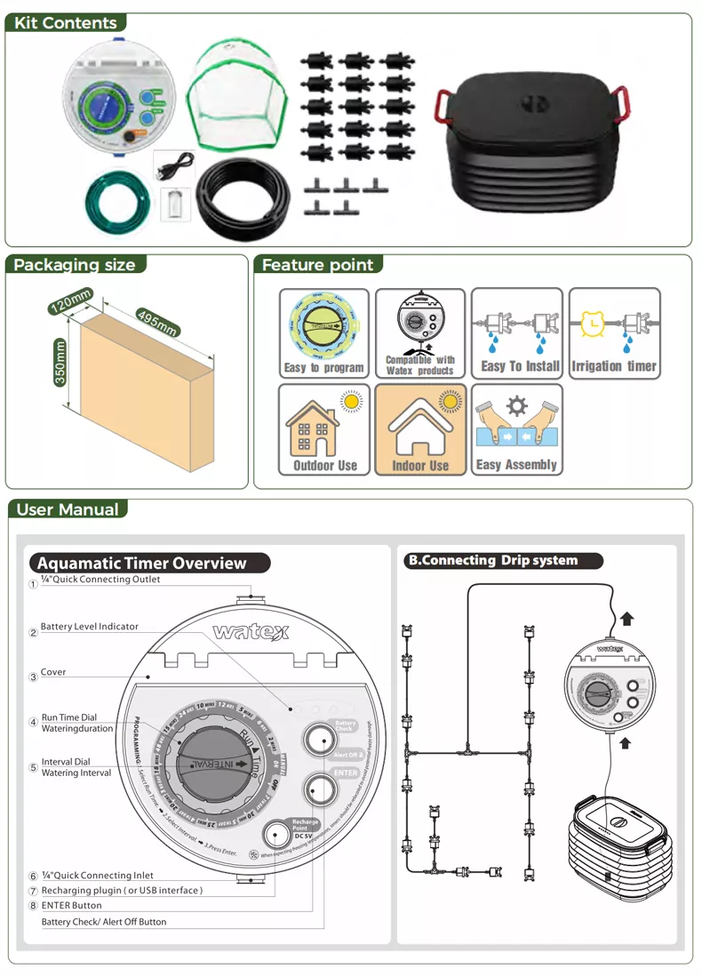 Aquamatic Drip watering kit( Battery not included), Included: 15M*4mm Tube, 4mm T*5PCS, Inline drip*10pcs, end drip*5 pcs.