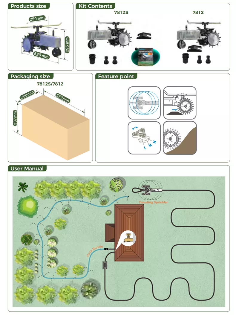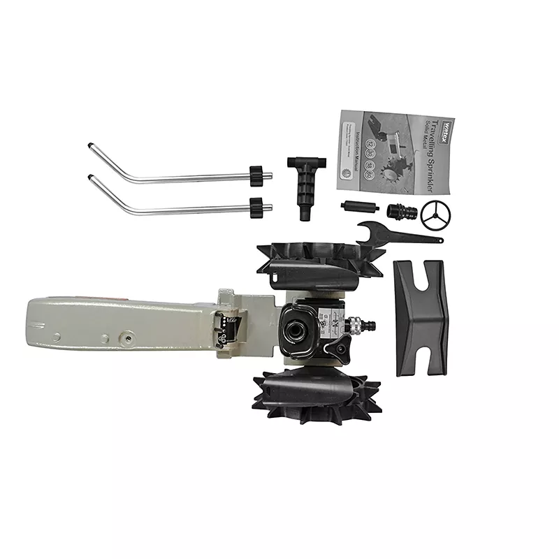 Traveling Sprinkler irrigation sprayer, powered by tap water pressure, follows the path set by your existing garden hose for watering. It automatically stops at preset positions upon completion, making it the ideal irrigation partner for expansive lawns or green belts. The heavy duty cast iron body with outdoor-grade paint ensures durability and ruggedness. Fully automated for hands-free operation effortless, convenient, and eco-friendly.